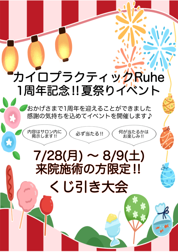 開業1周年記念‼︎ 投稿日 2025年7月15日 著者 IzumiNozomi カテゴリー 新着情報 2025年7月29日、カイロプラクティックRuhe開業1周年を迎えます。 感謝の気持ちを込めてくじ引きイベントを開催します♪ 1/2の確率で当たりが出ます。参加賞は100円引き券。何が当たるかは、サロン内に掲示しています。 常連さんはもちろん、新規の方も挑戦できます。 お得なこの機会に、ご予約お待ちしております♪