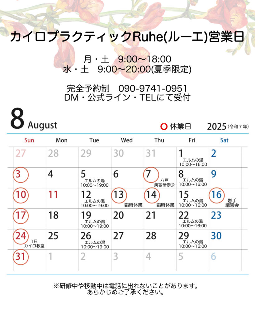8月営業日 投稿日 2025年7月25日 著者 IzumiNozomi カテゴリー 新着情報 8月は13日14日、臨時休業させていただきます。 また、7/28〜8/9まで開業1周年記念イベントを開催しています。 8/24は、1日カイロプラクティック教室を開催します。自分や家族の健康のために学ぶもよし、仕事として学ぶもよし、の内容となっております♪ 興味のある方はぜひ参加してください。 ご予約・お問い合わせは、電話、公式ライン、Instagramにてお願いします。