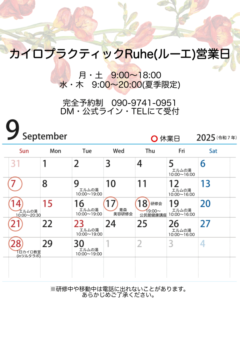 9月の営業日です。 夏の暑さで体調が悪くなっていませんか?夏バテは自律神経の乱れで不調を感じます。 また、紫外線を多く浴びたお肌をケアして冬に備えることも大事になります。 9/18は新和公民館で美容カイロ教室を開催します […]