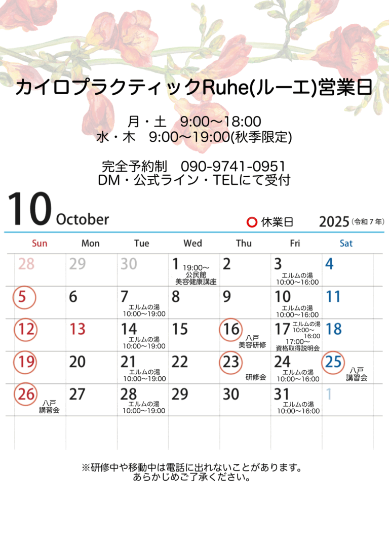 みなさん、こんにちは♪ だいぶ過ごしやすくなってきましたね。もう10月の予定をあげる日になるなんて…ほんと、あっという間です… 10月は、公民館健康講座4回目、美容編とカイロプラクティック資格取得説明会が開催されます。 […] -