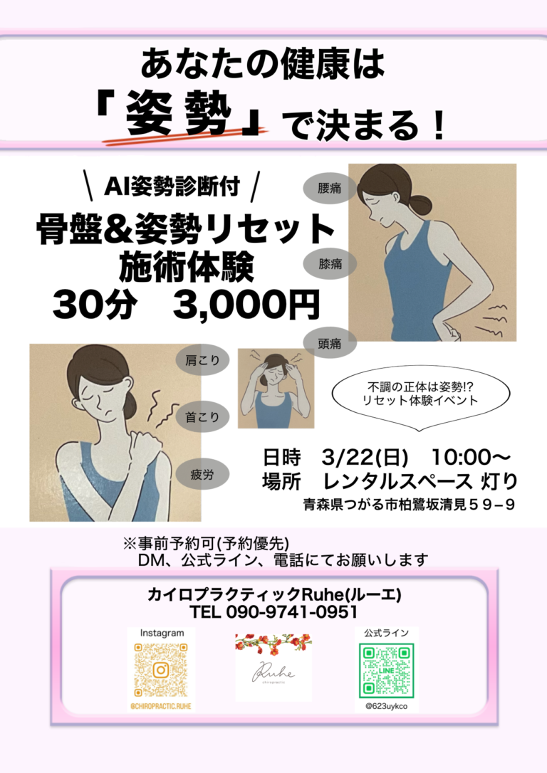 3月のイベントは、こちら。 初めて参加させていただきます。 今回が5回目ということで、10店舗以上参加するみたいです。 自分では気づきにくい姿勢をAIで丸ごと診断します。 姿勢のクセ、改善のアドバイスなど、施術をしながら […]